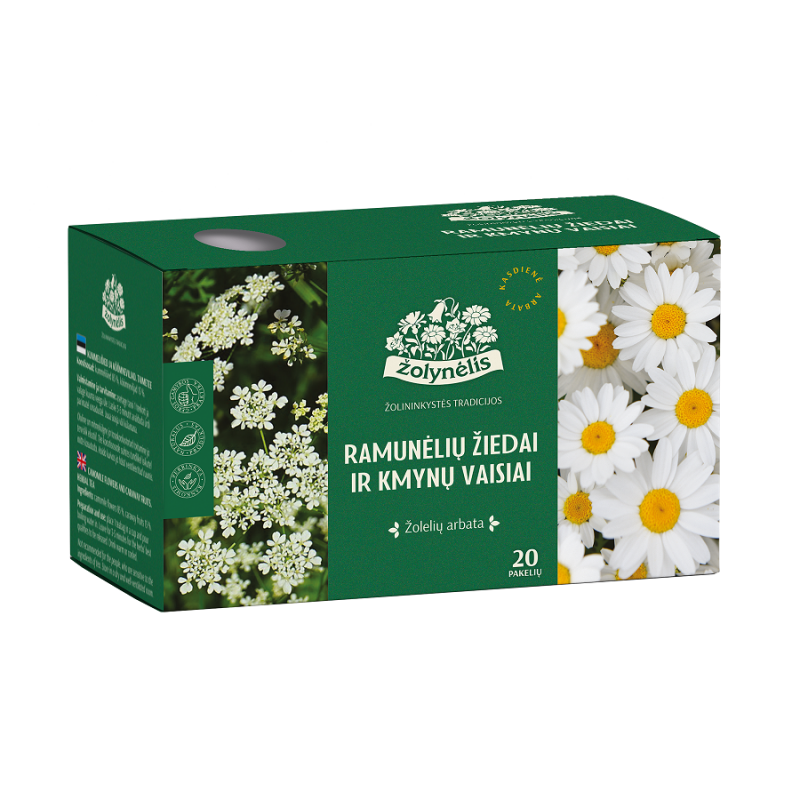 Ramunėlių žiedai 85%, kmynų vaisiai 15%.