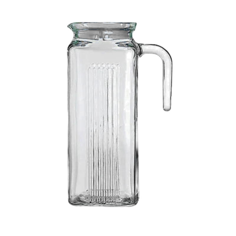 Klasikinio dizaino skaidraus stiklo ąsotis su patogia rankena ir baltos spalvos dangteliu. Puikiai tinka vandeniui, sultims, limonadui ar kitiems gėrimams patiekti namuose ar terasoje.
