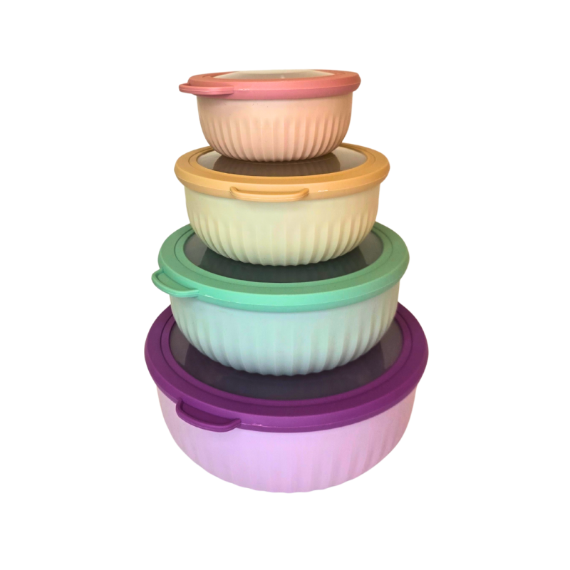 • Dizainas: pastelinių spalvų dubenys su banguotu paviršiumi ir sandariais dangteliais