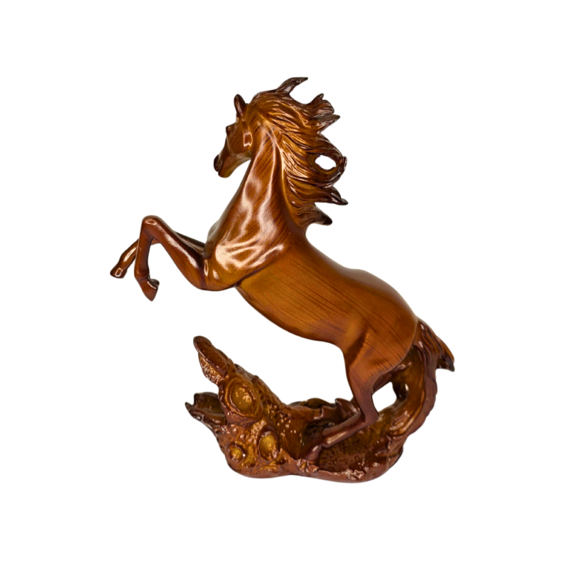 Išraiškinga dekoratyvinė statulėlė vaizduoja ant užpakalinių kojų pašokusį žirgą – laisvės, jėgos ir energijos simbolį. Kruopščiai išdirbtos detalės, dinamiškos formos ir medžio imitacijos paviršius suteikia statulėlei elegancijos bei išskirtinumo. Puikiai tinka svetainės, darbo kambario, biuro ar lentynos dekorui.