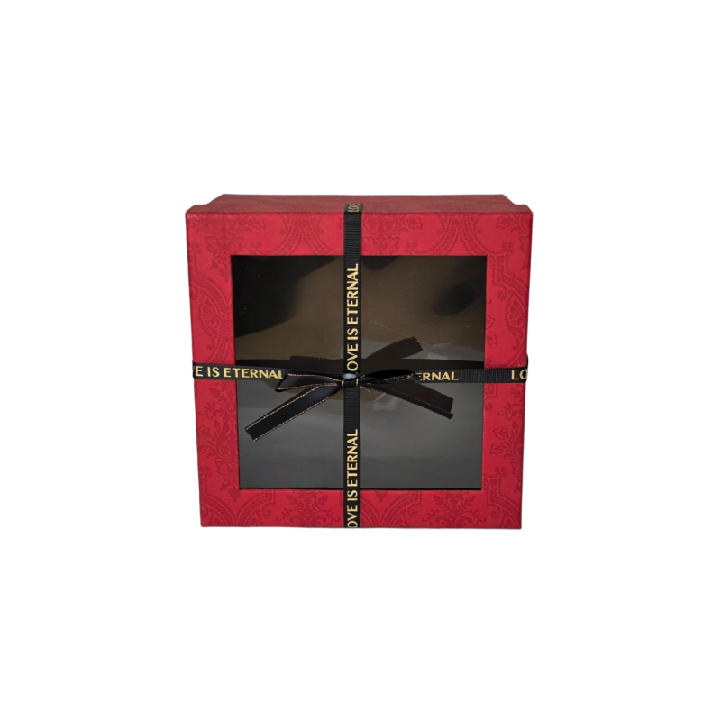 Prabangi dovanų dėžutė su langeliu ir juodu kaspinu – elegantiškas pasirinkimas ypatingai progai. Raudona dėžutės spalva su subtiliu ornamentu derinama su juodu kaspinu, puoštame auksiniu užrašu LOVE IS ETERNAL, kuris suteikia išskirtinumo ir prabangos pojūtį. Dėžutės langelis leidžia matyti viduje esančią dovaną.