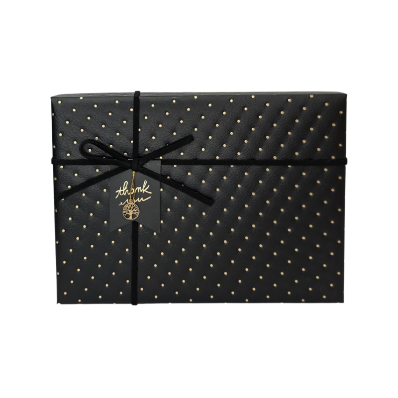 Elegantiška juoda dovanų dėžutė su subtiliais auksiniais taškeliais – klasikinis ir prabangus pasirinkimas dovanoms. Dėžutė puošta juodu kaspinu ir pakabuku su užrašu Thank you, suteikiančiu ypatingo dėmesio pojūtį. Tvirta konstrukcija ir kruopščiai apgalvotas dizainas paverčia ją puikia dovanos pakuote be papildomo įpakavimo.