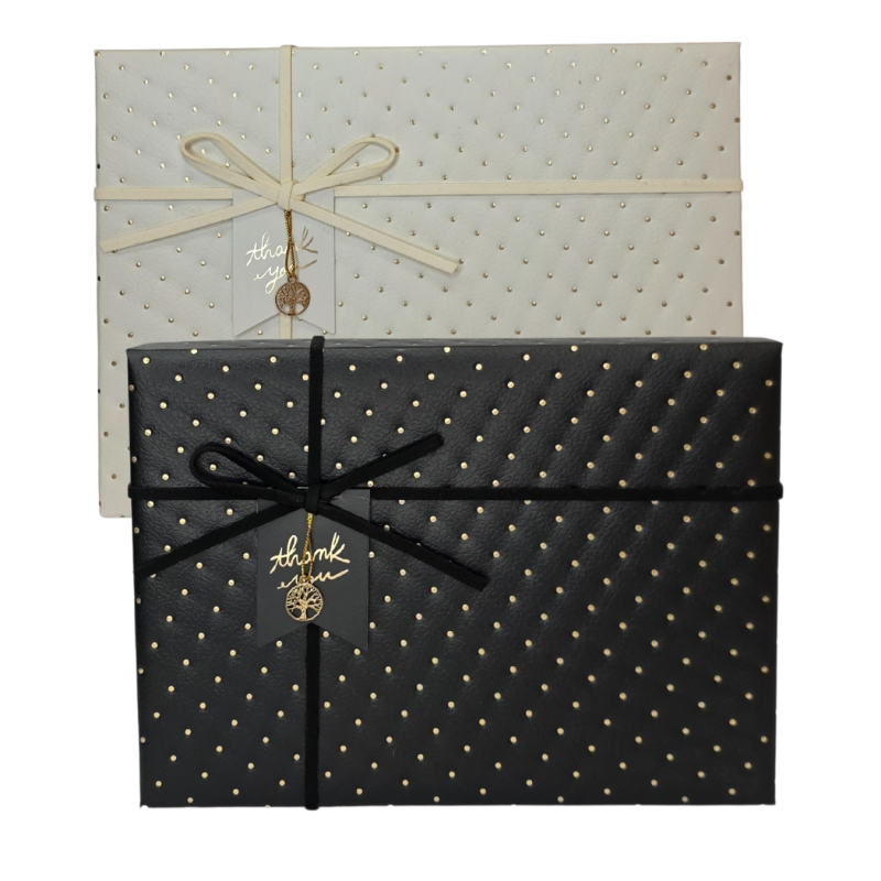 Elegantiška dovanų dėžutė su subtiliais auksiniais taškeliais – klasikinis ir prabangus pasirinkimas dovanoms. Dėžutė puošta kaspinu ir pakabuku su užrašu Thank you, suteikiančiu ypatingo dėmesio pojūtį. Tvirta konstrukcija ir kruopščiai apgalvotas dizainas paverčia ją puikia dovanos pakuote be papildomo įpakavimo.