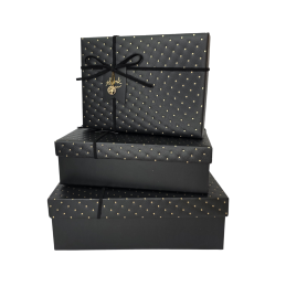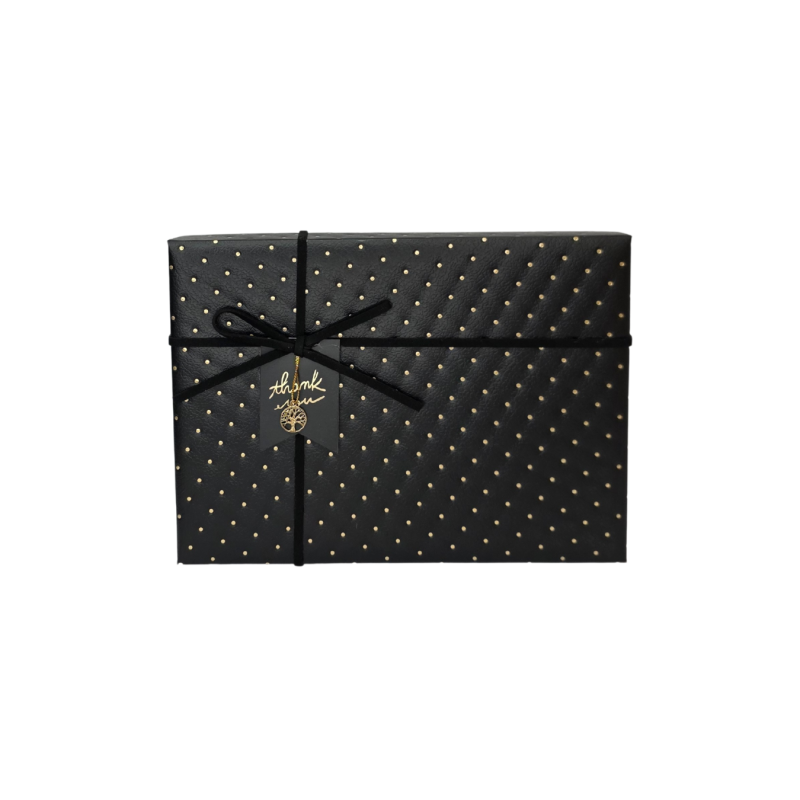 Elegantiška juoda dovanų dėžutė su subtiliais auksiniais taškeliais – klasikinis ir prabangus pasirinkimas dovanoms. Dėžutė puošta juodu kaspinu ir pakabuku su užrašu Thank you, suteikiančiu ypatingo dėmesio pojūtį. Tvirta konstrukcija ir kruopščiai apgalvotas dizainas paverčia ją puikia dovanos pakuote be papildomo įpakavimo.