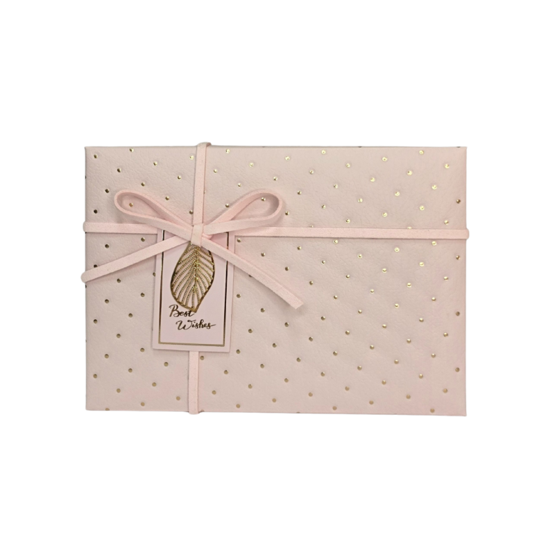 Aprašymas: Elegantiška dovanų dėžutė su užrašu „Best Wishes“ – puikus pasirinkimas dovanoms, pinigams ar smulkmenoms supakuoti. Švelniai rožinė spalva su auksiniais taškeliais suteikia prabangos ir subtilumo įspūdį, o kaspinėlis su dekoratyviniu lapeliu prideda išskirtinumo.