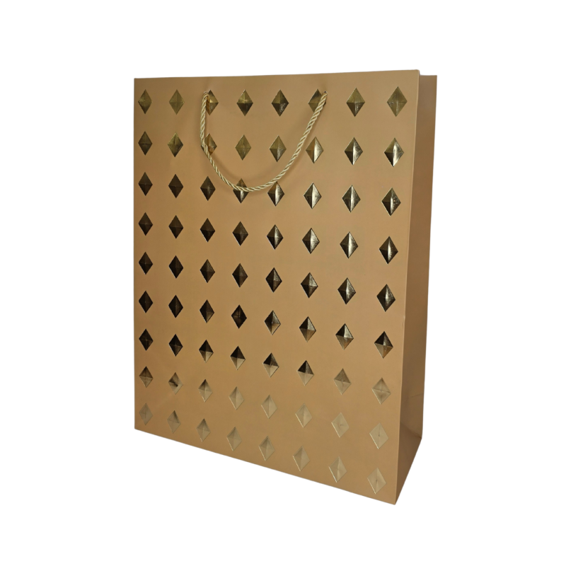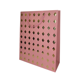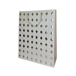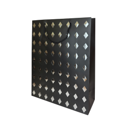 Modernus ir elegantiškas dovanų maišelis su blizgiais rombo formos raštais. Subtilus geometrinis dizainas suteikia dovanai išskirtinumo ir stilingumo. Puikiai tinka įvairioms progoms – gimtadieniams, šventėms, vestuvėms ar verslo dovanoms. Pagamintas iš tvirto popieriaus su patogiomis virvelinėmis rankenomis.