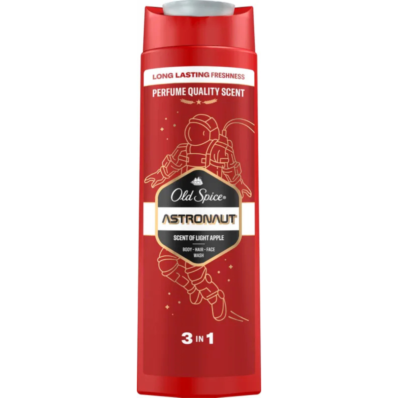 Old Spice Astronaut 3 in 1 dušo želė – universali priemonė, skirta kūno, plaukų ir veido priežiūrai. Efektyviai valo odą ir plaukus, suteikia ilgalaikį gaivumo pojūtį ir išskirtinį, gaivų obuolių aromatą, kuris suteikia energijos ir švaros jausmą visai dienai.