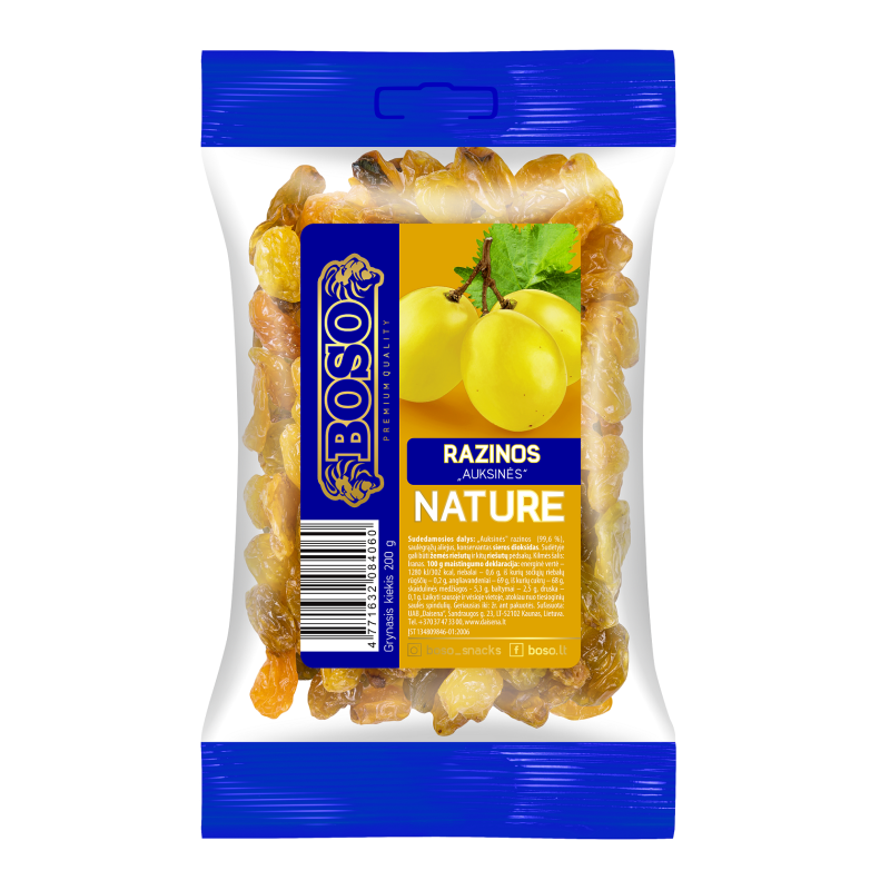 Auksinės razinos (99,6%), saulėgrąžų aliejus, konservantas SIEROS DIOKSIDAS. Sudėtyje gali būti ŽEMĖS RIEŠUTŲ ir kitų RIEŠUTŲ pėdsakų.