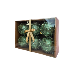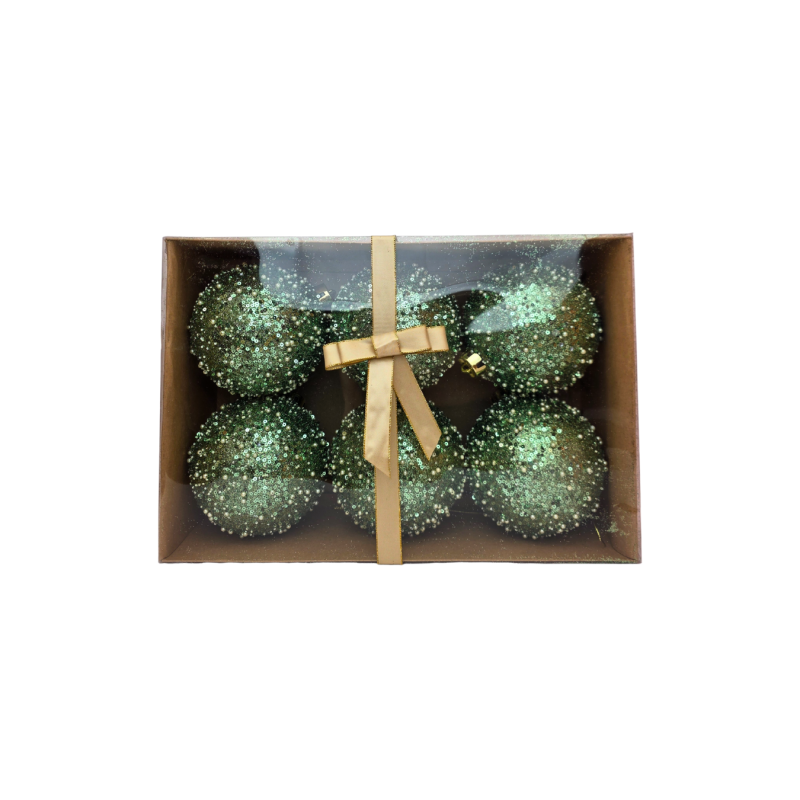 Kalėdiniai eglutės žaisliukai – elegantiški ir spindintys žalios spalvos burbulai, padengti blizgučiais bei smulkiais karoliukais, kurie gražiai atspindi šviesą ir suteikia eglutei prabangos pojūtį. Rinkinyje – 6 vienetai žaisliukų, supakuotų dailioje dėžutėje su kaspinu, todėl tai puiki dovanos idėja arba stilingas jūsų šventės akcentas.