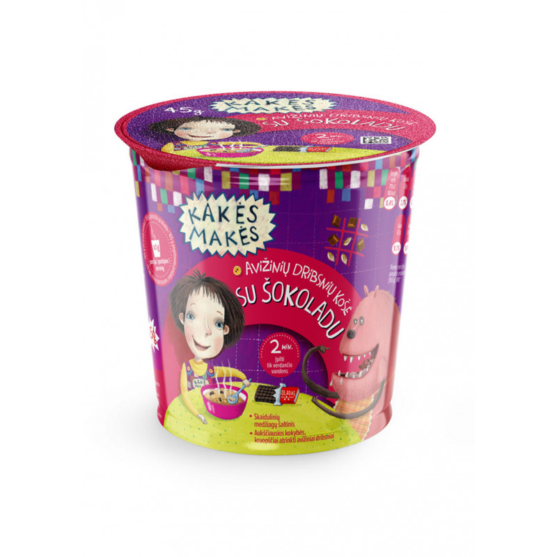 SUDEDAMOSIOS DALYS: pilno grūdo AVIŽINIAI dribsniai 68,9%, cukrus, lieso PIENO milteliai, šokolado gabaliukai4,4% (cukrus, kakava, kakavos sviestas, emulsiklis E322) (sudėtyje yra SOJOS produktų), krakmolas, liesa kakava, natūrali kvapioji medžiaga, druska.