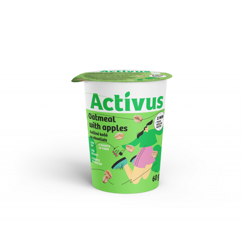 SUDEDAMOSIOS DALYS: viso grūdo AVIŽINIAI dribsniai (75,8%), cukrus, nenugriebto PIENO milteliai, džiovintos obuoliai (5,0%), druska, natūrali kvapioji medžiaga, lipnumą reguliuojanti medžiaga E551.