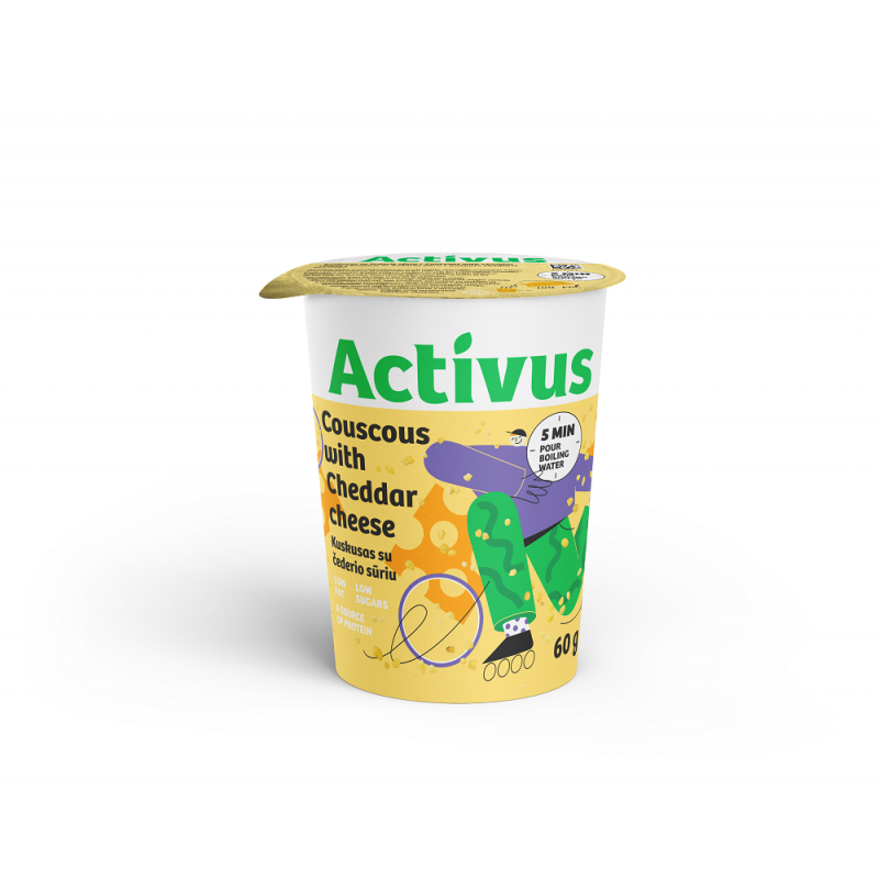 SUDEDAMOSIOS DALYS: KVIETINĖS kuskuso kruopos (85,8%), maltodekstrinas, čederio SŪRIO milteliai (3,5%) (SŪRIS, emulsinimo druskos E339), druska, mielių ekstraktas, svogūnai, petražolės, natūralios kvapiosios medžiagos (sudėtyje yra PIENO produktų), česnakų laiškai, lipnumą reguliuojanti medžiaga E551. Sudėtyje gali būti VĖŽIAGYVIŲ, SOJŲ PUPELIŲ, SALIERŲ, GARSTYČIŲ ir jų produktų pėdsakų.