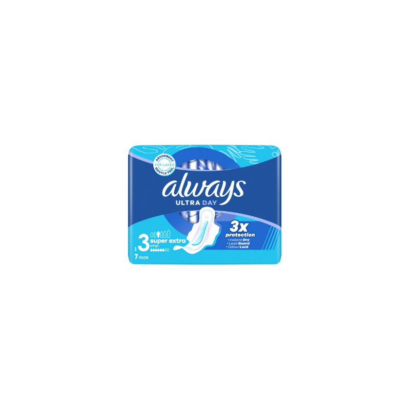 „Always Ultra Day Super Extra“ (3 dydis) paketai yra puikus pasirinkimas toms, kurioms reikia patikimos ir sustiprintos apsaugos gausiomis dienomis, išlaikant komfortą ir diskretiškumą.