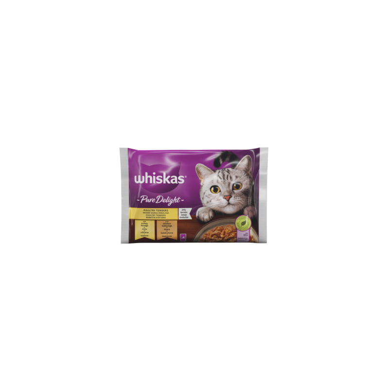 Whiskas su vištiena; mėsa ir mėsos perdirbimo produktai (21%, 100% natūralūs*; įskaitant vištienos 4% gabaliukų**), daržovių baltymų ekstraktai, mineralai (0,7%), įvairus cukrus, daržovių perdirbimo produktai. Su kalakutiena: ; mėsa ir mėsos perdirbimo produktai (21%, 100% natūralūs*; įskaitant vištienos 4% gabaliukų**), daržovių baltymų ekstraktai, mineralai (0,7%), įvairus cukrus, daržovių perdirbimo produktai. Analitinės sudedamosios dalys (%): žali baltymai: 11,7; žali riebalai: 2,2; neorganinė medžiaga: 1,2; žalia ląsteliena: 0,20; drėgnis: 84. Priedai (kiekis kilograme): maistiniai priedai: vitaminas B: 27,7mg, vitaminas D3: 189TV, vitaminas E: 18,5mg, taurinas: 640mg, varis (vario (II) sulfatas pentahidratas): 1,4mg, jodas (kalcio jodidas, bevandenis): 0,33mg, geležis (geležies (II) sulfato monohidratas): 16,5mg, manganas (mangano sulfato monohidratas): 3,3mg, cinkas (cinko sulfato monohidratas): 21,1mg. Technologiniai priedai: kasijų derva: 2312mg.