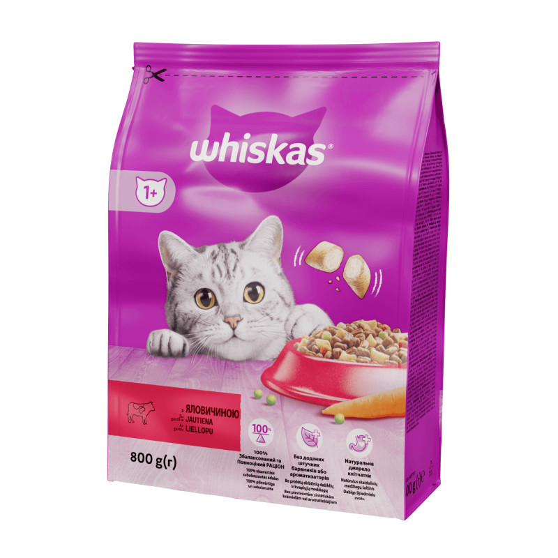 Kruopos, mėsa ir mėsos perdirbimo produktai (įskaitant 4% jautienos rudose pagalvėlėse*), aliejai ir riebalai, daržovių baltymų ekstraktai, daržovių perdirbimo produktai, mineralai, mielės, žuvis ir žuvies perdirbimo produktai, daržovės (įskaitant 0.5% džiovintų morkų (atitinkančių 4% šviežių morkų) oranžinėse pagalvėlėse ir 1% džiovintų žirnelių (atitinkančių 4% šviežių žirnelių) žaliose pagalvėlėse*), įvairus cukrus. *Rudos pagalvėlės paprastai sudaro 70% gaminio, oranžinės ir žalios pagalvėlės paprastai po 8% gaminio. Analitinės sudedamosios dalys (%): žali baltymai: 30.0; žali riebalai: 12.0; neorganinė medžiaga: 9.0; žalia ląsteliena: 2.0; kalcis: 1.4; fosforas: 0.83.