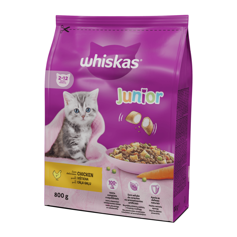 Kačiukams ≤ 3 mėn. reikia 45-55 g pašaro kasdien, kačiukams nuo 4 iki 5 mėn. reikia 65-75 g kasdien, kačiukams nuo 6 iki 12 mėn. reikia 70-80 g sauso pašaro kasdien. 15 g sauso ėdalo galima pakeisti 1 maišeliu 85 g WHISKAS® šlapio ėdalo. Nepamirškite kalorijų, gaunamų iš skanėstų. Šerti skirti kiekiai pateikiami tik rekomendaciniais tikslais. Ėdalo kiekį koreguokite atsižvelgdami į savo kačiuko amžių, svorį ir aktyvumo lygį. Padalykite į porcijas, skirtas šerti visą dieną. Keisdami dietą, maistą pradėkite tiekti po truputį. Pasirūpinkite, kad visuomet būtų šviežio vandens.