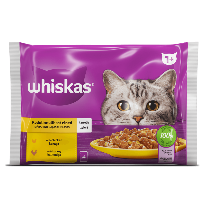 Jūsų katė myli gyvenimą. Štai kodėl konservuotas maistas maišelyje Whiskas® 1+ suteikia jai tiek energijos, kiek reikia, kad ji būtų laiminga ir gyvybinga. Aukštos kokybės, kruopščiai atrinktos sudedamosios dalys ir subalansuotos maistinės medžiagos konservuotame Whiskas® ėdale patenkina visus kasdienius 1+ metų amžiaus katės poreikius!