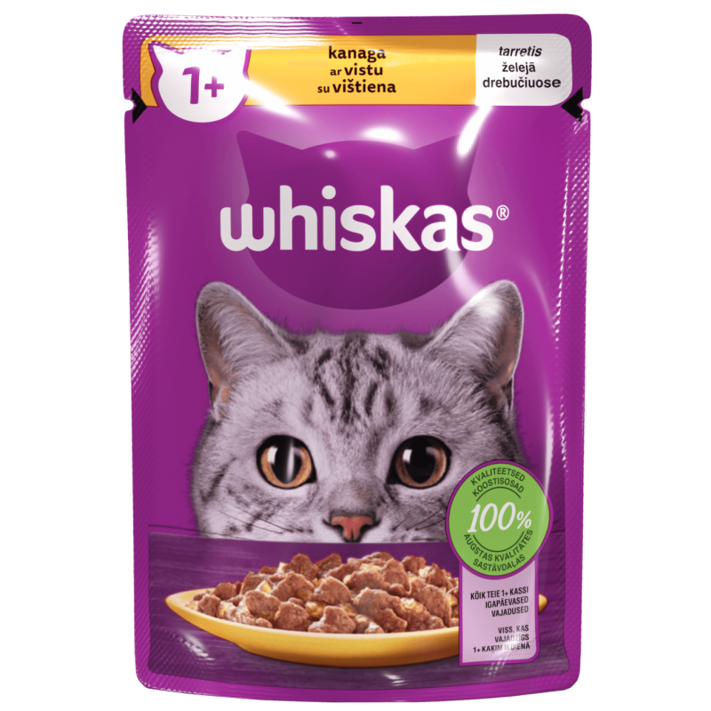 Jūsų katė myli gyvenimą. Štai kodėl konservuotas maistas maišelyje Whiskas suteikia jai tiek energijos, kiek reikia, kad ji būtų laiminga ir gyvybinga. Aukštos kokybės, kruopščiai atrinktos sudedamosios dalys ir subalansuotos maistinės medžiagos konservuotame Whiskas® ėdale patenkina visus kasdienius 1+ metų amžiaus katės poreikius!