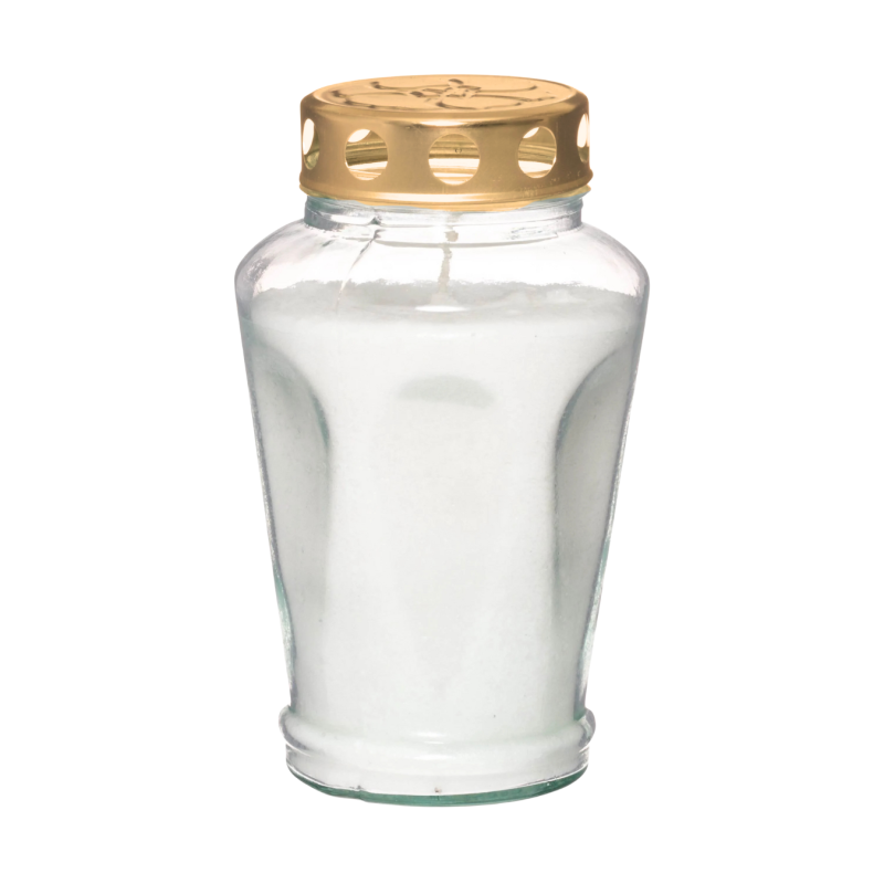 Ilgai deganti kapų žvakė, skirta ramiam ir tvarkingam kapų priežiūros laikotarpiui. Skaidrus stiklinis indas leidžia matyti degimą, o metalinis dangtelis su ventiliacijos angomis padeda apsaugoti liepsną nuo vėjo ir kritulių.