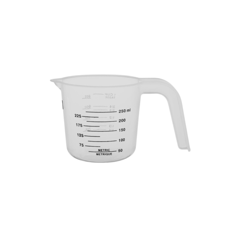 Patogus ir praktiškas plastikinis matavimo indelis, skirtas tiksliam skysčių ir birių produktų matavimui virtuvėje. Aiškiai pažymėta matavimo skalė leidžia lengvai ir tiksliai dozuoti ingredientus gaminant ar kepant.