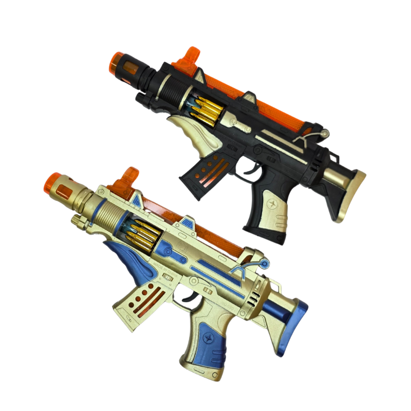 Įspūdingo dizaino žaislinis automatinis šautuvas su šviesos ir garso efektais suteikia žaidimams tikroviškumo ir smagaus veiksmo! Nuspaudus gaiduką, šautuvas šviečia, skleidžia garsus bei juda imitacinės kulkos.
