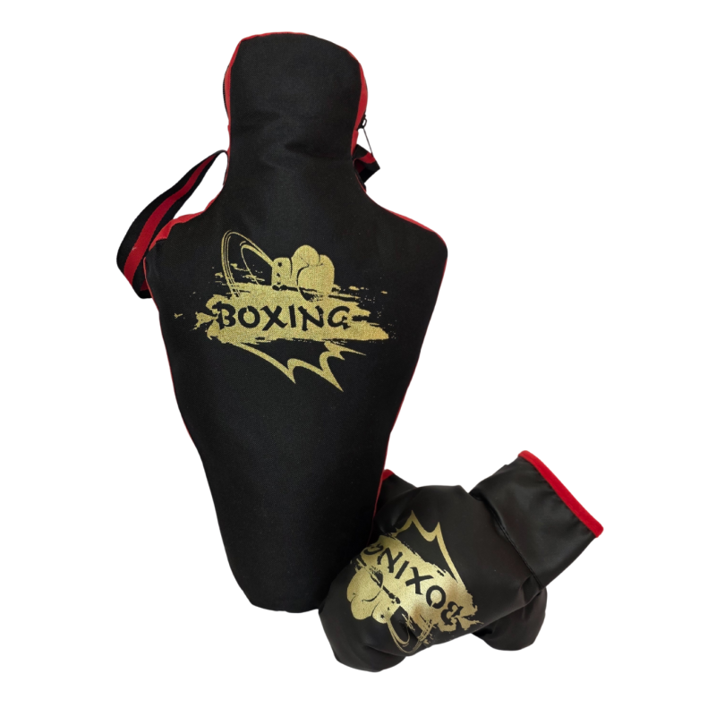 Puikus bokso rinkinys vaikams, norintiems išlieti energiją ir lavinti fizinį aktyvumą! Komplekte – bokso maišas ir pirštinės, pagamintos iš tvirtos medžiagos su auksiniu spaudiniu „BOXING“.