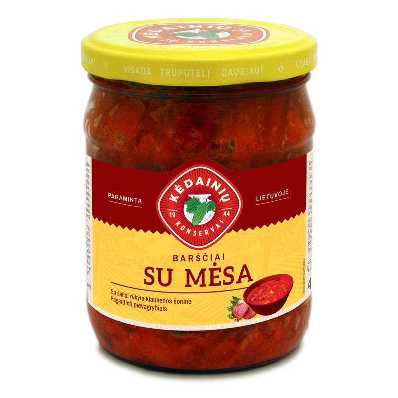 SUDEDAMOSIOS DALYS: burokėliai (50%), bulvės, kiauliena (8%), svogūnai, morkos, pomidorų pasta, baltosios pupelės, pievagrybiai, šaltai rūkyta kiaulienos šoninė be odos (2%) (kiaulienos šoninė, vanduo, tirštiklis E407, stabilizatoriai (E451, E452), kiaulienos baltymai, gliukozė, maltodekstrinas, druska, antioksidantas E316, kvapiosios medžiagos, prieskonių ekstraktai, konservantas E250), druska, vanduo, spirito actas, česnakai, prieskoniai, cukrus.