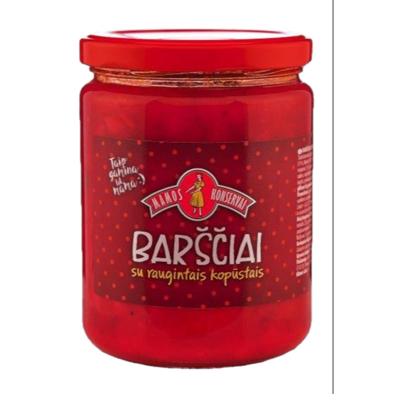 Burokėliai (44%), vanduo, kopūstai (11%), bulvės (8%), pomidorų pasta (5%), morkos (4%), svogūnai (3%), rapsų aliejus, druska, KVIETINIAI miltai, cukrus, rūgštingumą reguliuojanti medžiaga: citrinų rūgštis, prieskoniai. Sudėtyje yra GRŪDŲ, turinčių GLITIMO ir jų produktų.