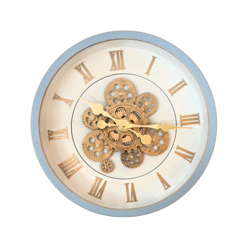 Stilingas pakabinamas sieninis laikrodis su išskirtiniu mechanizmų dizainu centre. Laikrodis turi melsvą rėmelį ir auksinius romėniškus skaitmenis, kurie suteikia elegantišką, klasikinį įvaizdį.