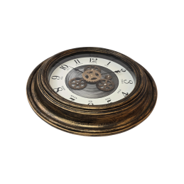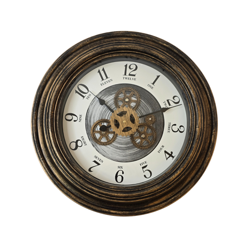 Išskirtinio dizaino sieninis laikrodis su dekoratyviniais krumpliaračiais suteiks jūsų namams ar biurui industrinio stiliaus akcentą. Medinis rėmelis su sendinto efekto apdaila ir matomas vidinis mechanizmas sukuria klasikinį, bet kartu modernų įvaizdį.