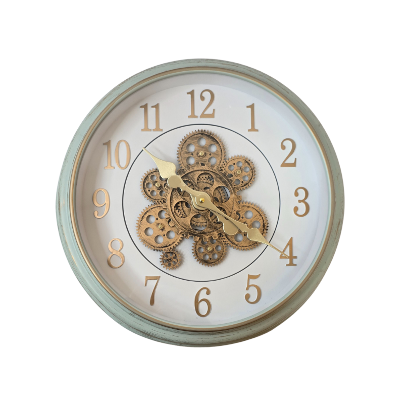 Išskirtinio dizaino sieninis laikrodis su dekoratyviniais krumpliaračiais taps išraiškingu jūsų interjero akcentu. Auksinės rodyklės, švelniai žvilgantys skaičiai ir matomas mechanizmas suteikia laikrodžiui prabangos bei industrinio stiliaus žavesio. Krumpliaračių judėjimas sukuria subtilų dinamiškumo efektą, o šviesus fonas leidžia laikrodžiui puikiai derėti prie įvairių sienų spalvų.