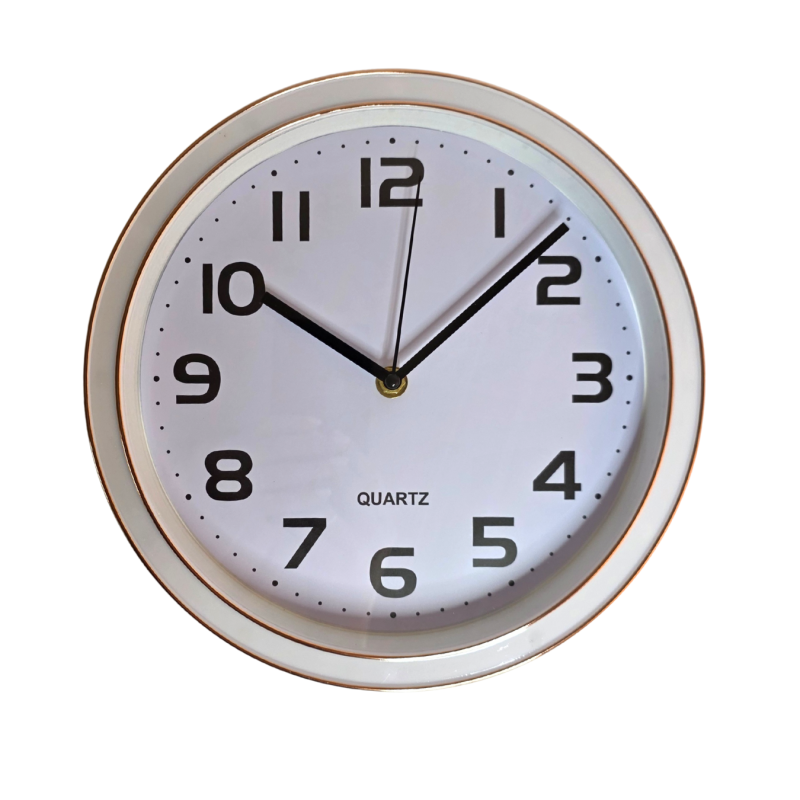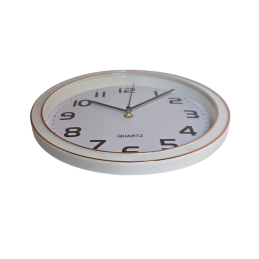Klasikinio stiliaus sieninis laikrodis su baltu fonu ir aiškiais, juodais skaičiais – puikus pasirinkimas tiek namams, tiek biurui. Aplink rėmelį subtiliai įkomponuota auksinė linija, suteikianti elegancijos.