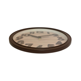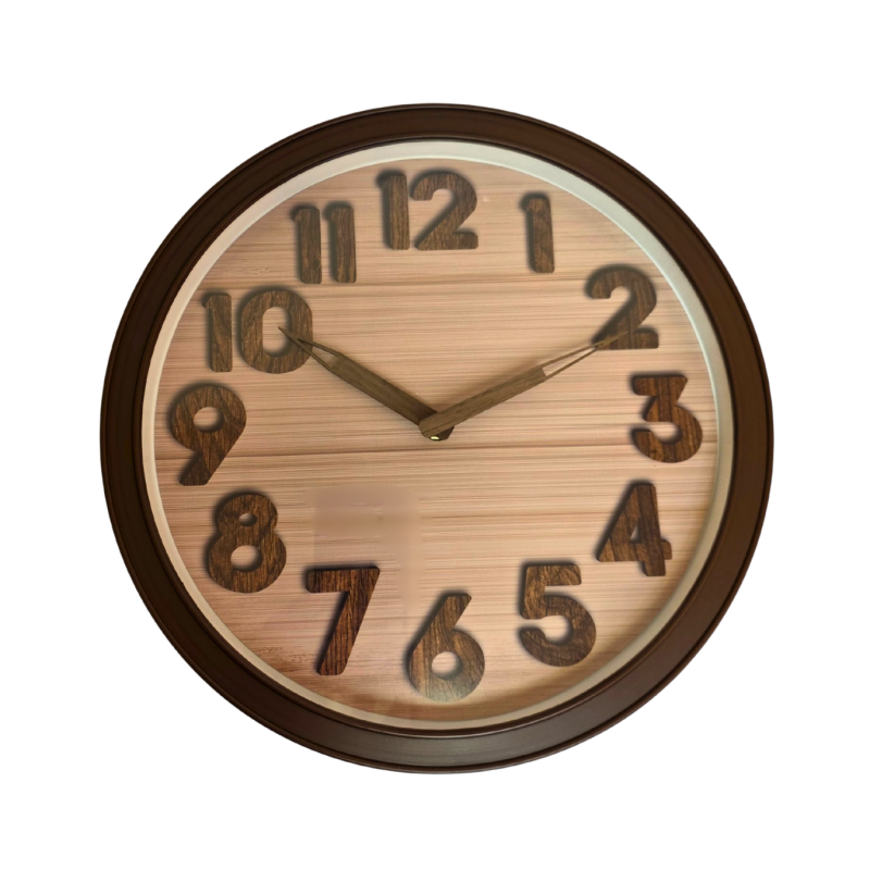 Stilingas sieninis laikrodis su medžio rašto ciferblatu ir tamsaus medžio imitacijos detalėmis. Šiltos rudos spalvos tonai suteikia jaukumo ir puikiai dera prie klasikinių ar natūralių interjero sprendimų.
