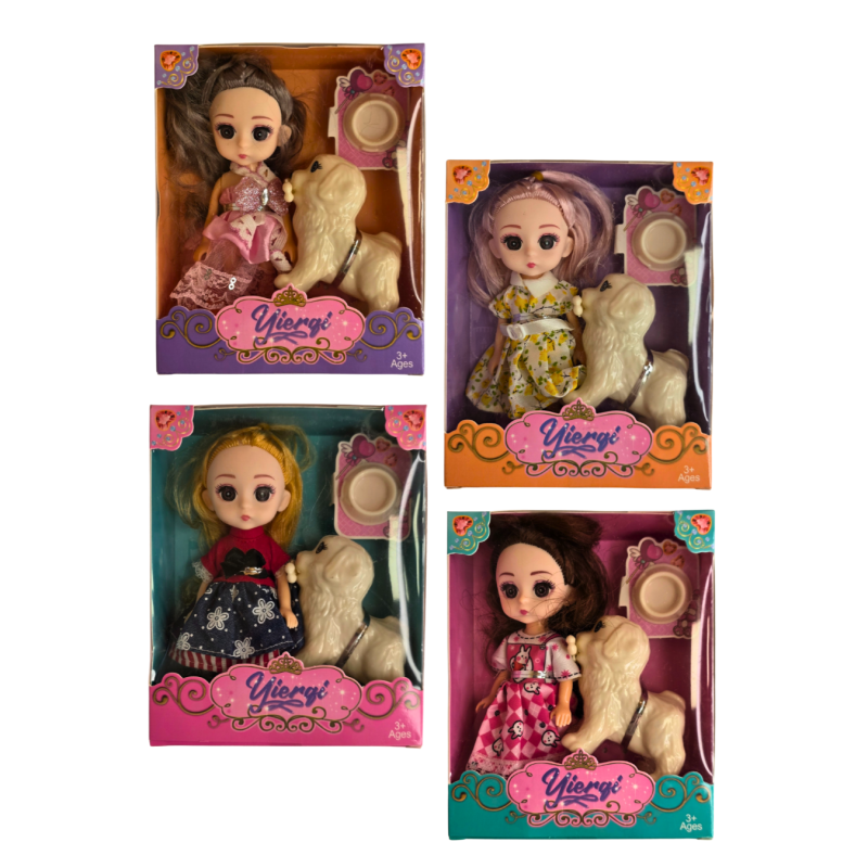 Žavinga lėlė su savo augintiniu šuniuku – puikus žaidimo rinkinys mažiesiems. Lėlė vilki gražią suknelę, o šuniukas turi pavadėlį. Rinkinyje taip pat yra maisto dubenėlis.