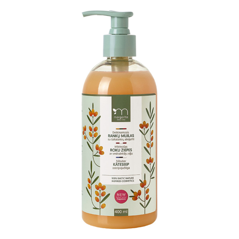 Drėkinamasis rankų muilas su šaltalankių aliejiumi švelniai prausia ir puoselėja rankų odą. Šaltalankių aliejus – natūralus vitaminų C, E, P ir karotino šaltinis, kuris maitina ir puoselėja odą. Patikrinta dermatologų.