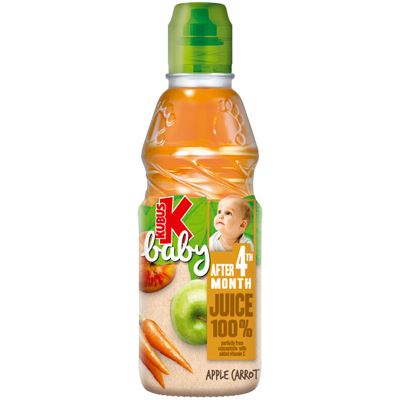 Obuolių sultys pagamintos iš sulčių koncentratų (61%), morkų tyrė (26%), obuolių tyrė (21%), vitaminas C (L – askorbo rūgštis)