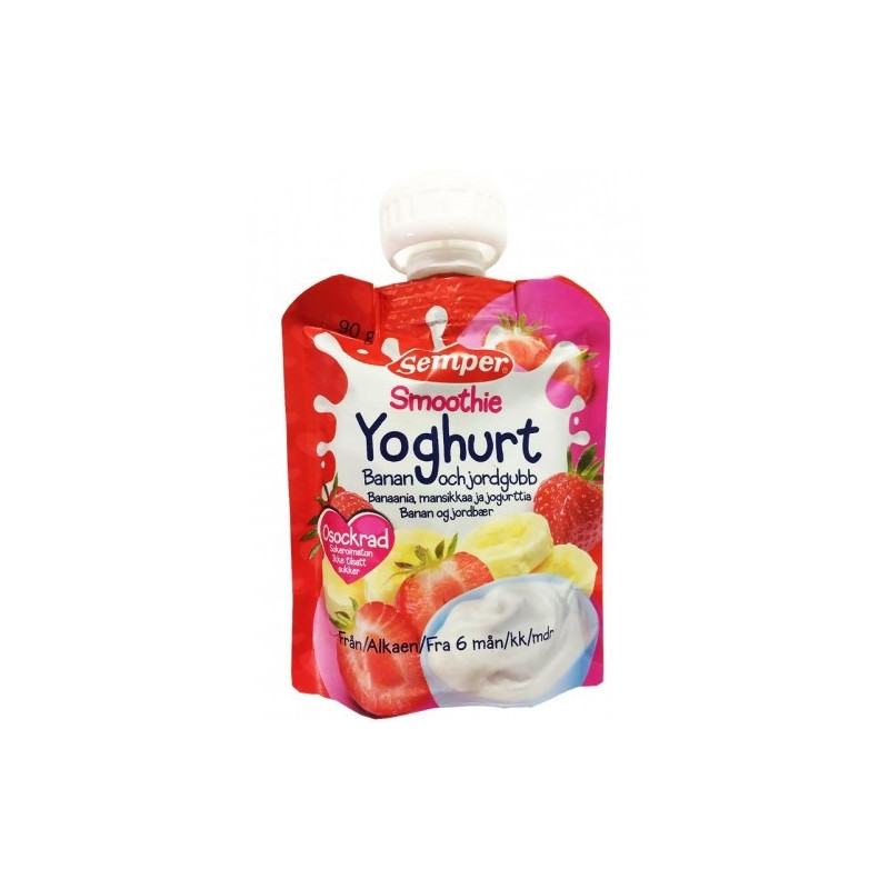 Bananų tyrė (42%), braškių tyrė (30%), termiškai apdorotas JOGURTAS (20%), vanduo, kukurūzų krakmolas, aronijų sultys, vitaminas C, citrinų sultys (iš koncentrato).