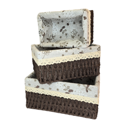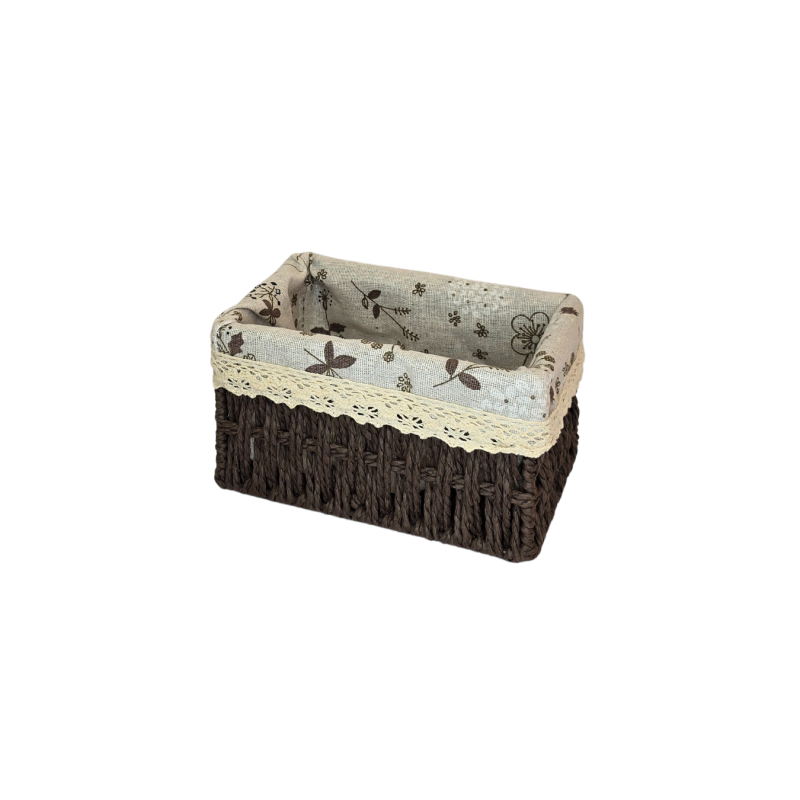 Stilingas stačiakampis pintas krepšelis su šviesiu audiniu viduje ir dekoratyvine nėrinių juostele – praktiškas ir estetiškas sprendimas jūsų namams. Tamsiai rudos spalvos pynimas kontrastuoja su šviesiu audiniu, o gėlėtas raštas suteikia krepšeliui jaukumo ir klasikinio žavesio.