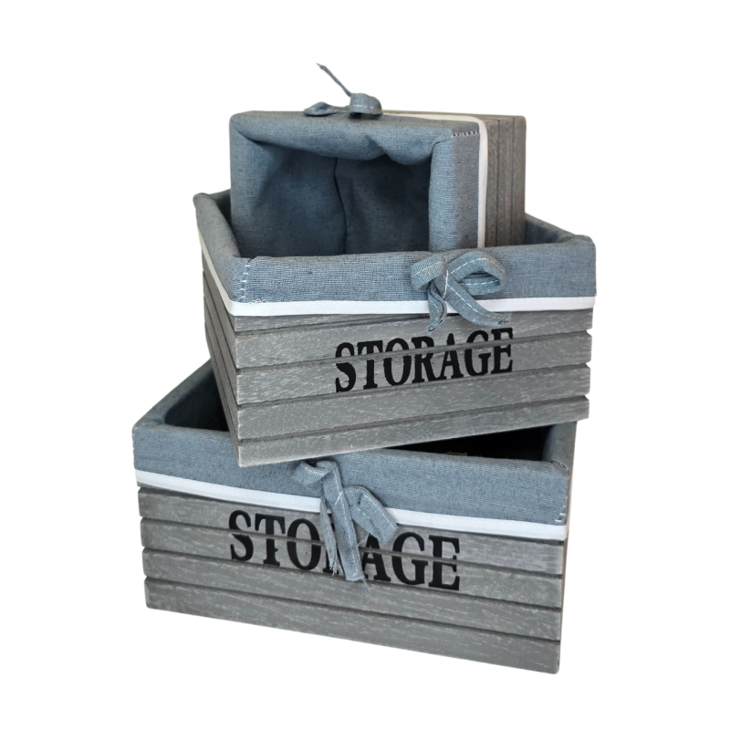 Stilingas medinis krepšelis su audinio įdėklu – praktiškas ir dekoratyvus daiktas, tinkantis tiek namų, tiek biuro aplinkai. Pilkos spalvos medinis korpusas su užrašu STORAGE ir dekoratyvine juostele bei kaspinu suteikia krepšeliui modernų, bet jaukų įvaizdį. Audinį galima išimti ir išplauti.