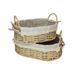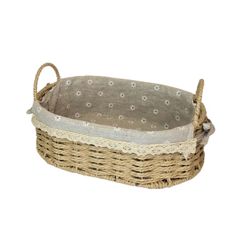 Dekoratyvus pintas krepšelis su švelnios spalvos audiniu viduje ir nėrinių juostele viršuje – puikus pasirinkimas tiek praktiškam naudojimui, tiek interjero papuošimui. Natūrali pintinė struktūra ir gėlėtas audinys suteikia krepšeliui jaukumo bei kaimiško stiliaus žavesio.