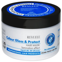 REVUELE COLOUR GLOSS & PROTECT plaukų kaukė, 500 ml Kaukė sukurta dažytiems plaukams prižiūrėti. Užtikrina ilgalaikę plauku spalvą ir suteikia plaukams spindesio. Padengia plaukus apsaugine plėvele. Palengvina šukavimą. Pasižymi laminavimo efektu. Sudėtis papildyta skystu šilku, 3D - silikonu.