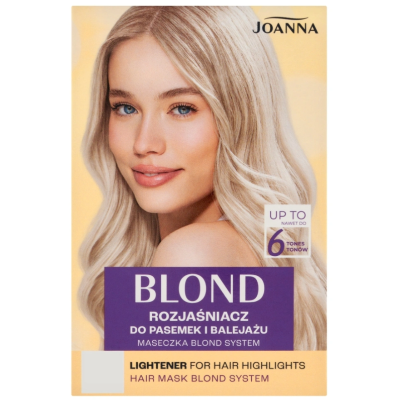 Suteikite plaukams švytinčio, natūraliai atrodančio blond atspalvio su Joanna Blond šviesikliu, skirtu sruogoms. Pažangi Blond System formulė leidžia saugiai ir efektyviai pašviesinti plaukus iki net 6 tonų, kartu juos puoselėjant ir apsaugant.