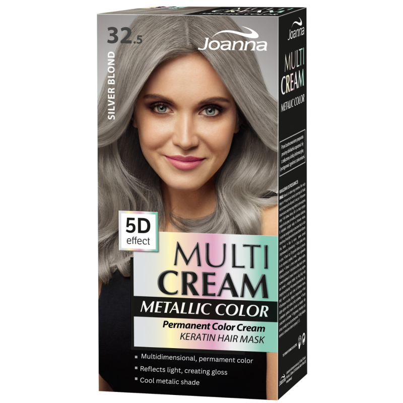 Suteikite savo plaukams modernų, šaltą sidabrinio blond atspalvį ir išskirtinį metalinį žvilgesį su Joanna Multi Cream Metallic Color plaukų dažais. Pažangi formulė sukurta taip, kad spalva atrodytų daugiamatė, spindinti ir itin moderni, o plaukai – glotnūs bei prižiūrėti.