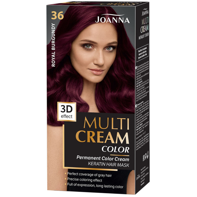 Suteikite savo plaukams prabangų, sodrų karališko bordo atspalvį su Joanna Multi Cream Color plaukų dažais. Intensyvi spalva ir pažangi formulė leidžia pasiekti tolygų, profesionalų rezultatą, o plaukai po dažymo atrodo glotnūs, žvilgantys ir gyvybingi.