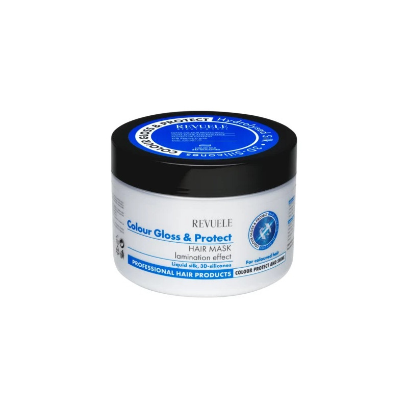 REVUELE COLOUR GLOSS & PROTECT plaukų kaukė, 500 ml Kaukė sukurta dažytiems plaukams prižiūrėti. Užtikrina ilgalaikę plauku spalvą ir suteikia plaukams spindesio. Padengia plaukus apsaugine plėvele. Palengvina šukavimą. Pasižymi laminavimo efektu. Sudėtis papildyta skystu šilku, 3D - silikonu.