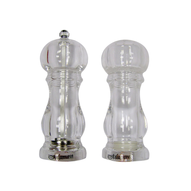 Klasikinio dizaino druskos ir pipirų malūnėlių rinkinys, skirtas kasdieniam naudojimui virtuvėje ar ant stalo. Skaidrus korpusas leidžia lengvai matyti prieskonių kiekį, o patikimas mechanizmas užtikrina tolygų ir patogų malimą.