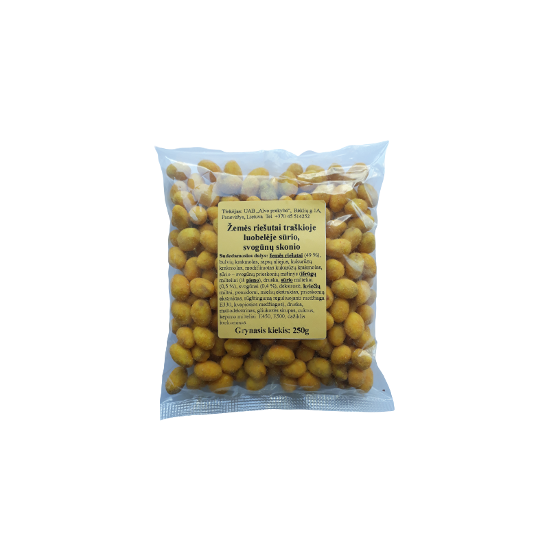ŽEMĖS RIEŠUTAI 49%, bulvių krakmolas, rapsų aliejus, kukurūzų krakmolas, modifikuotas kukurūzų krakmolas, sūrio-svogūnų prieskoniai (išrūgų milteliai (iš PIENO), druska, sūrio milteliai 0,5%, svogūnai 0,4%, dekstrozė, KVIEČIŲ miltai, pomidorai, mielių ekstraktas, prieskonių ekstraktas, rūgštingumą reguliuojanti medžiaga E330, kvapiosios medžiagos), druska, maltodekstrinas, gliukozės sirupas, cukrus, kepimo milteliai: E450, E500; dažiklis kurkuminas. Galimi SEZAMŲ ir kitų RIEŠUTŲ, GARSTYČIŲ pėdsakai.