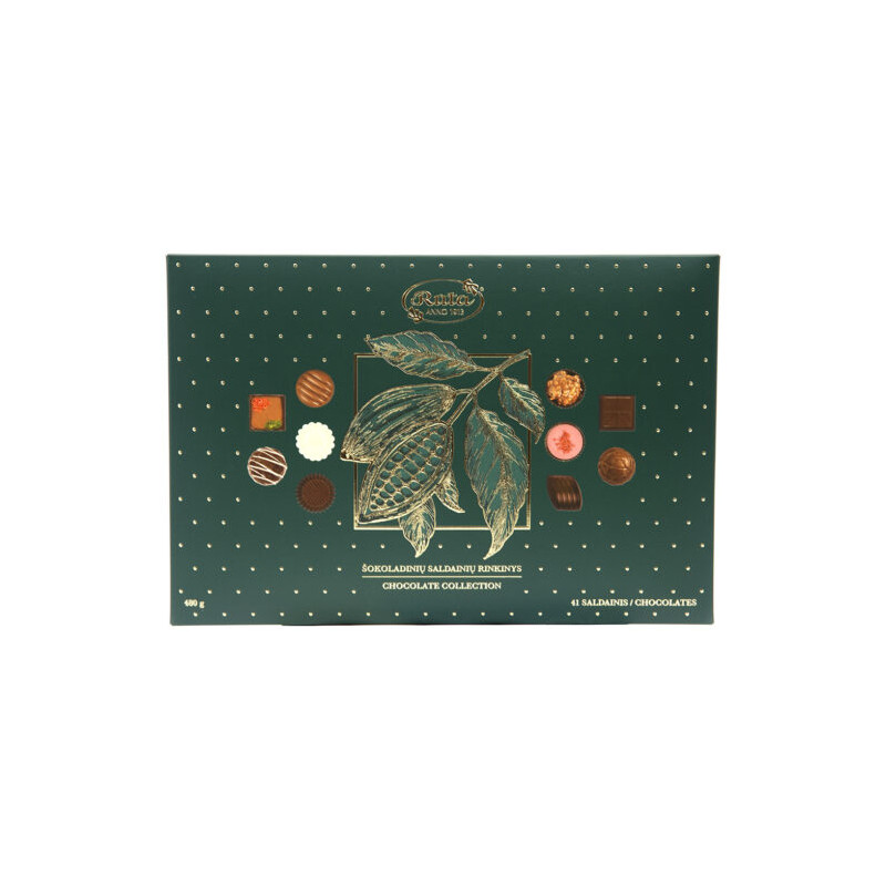 Šokoladas 31% (kakavos masė, cukrus, kakavos sviestas, emulsiklis SOJŲ lecitinas, natūrali vanilės kvapioji medžiaga), pieninis šokoladas 14% (cukrus, kakavos sviestas, nenugriebto PIENO milteliai, kakavos masė, IŠRŪGŲ milteliai, PIENO riebalai, emulsikliai (SOJŲ lecitinas, poliglicerolio poliricinoleatas), kvapioji medžiaga vanilinas), baltasis šokoladas 10% (cukrus, kakavos sviestas, nenugriebto PIENO milteliai, emulsiklis SOJŲ lecitinas, vanilės kvapioji medžiaga), base įdaras (baltasis šokoladas, GRIETINĖLĖ, cukrus, sutirštintos IŠRŪGOS, alkoholis, PIENO BALTYMAI), cukrus, baltojo šokolado įdaras (baltasis šokoladas 55% (cukrus, nenugriebto PIENO milteliai, kakavos sviestas, emulsiklis SOJŲ lecitinas, natūrali kvapioji medžiaga vanilė), augaliniai riebalai (palmių, palmių branduolių), gliukozės sirupas, Ruby šokoladas 2% (cukrus, kakavos sviestas, nenugriebto PIENO milteliai, kakavos masė, emulsiklis SOJŲ lecitinas, rūgštis (citrinų rūgštis), natūrali vanilės kvapioji medžiaga), aktinidijų uogos (1,4%), MIGDOLAI (1,4%), ANAKARDŽIAI (1,3%), LAZDYNO RIEŠUTAI (1,2%), plakamoji grietinėlė (grietinėlė (ir PIENO), PIENO baltymai, stabilizatorius karageninas), nugriebto PIENO milteliai, kakavos sviestas, KIAUŠINIŲ trynio įdaras (vynas Marsala (32%), KIAUŠINIŲ tryniai (32%), cukrus, gliukozės sirupas, etilo alkoholis, kvapioji medžiaga, KIAUŠINIŲ baltymai, dažikliai (karotenai, ribopflavinai)), PEKANINĖS KARIJOS (0,6%), kakavos masė mascarponės įdaras 0,4% (mascarponės sūris 50% (grietinėlė, nenugriebtas PIENAS, rūgštingumą reguliuojanti medžiaga citrinų rūgštis), cukrus, nenugriebtas PIENAS, KIAUŠINIŲ tryniai, etilo alkoholis, kvapioji medžiaga), IŠRŪGŲ milteliai, aviečių uogos (0,3%), liesi kakavos milteliai, ryžių traškučiai 0,2% (ryžių miltai (87%), cukrus, augalinis aliejus (rapsų), druska, tešlos kildymo medžiaga natrio rūgštusis karbonatas), pasiflorų įdaras 0,1% (gliukozės sirupas, pasiflorų vaisių koncentratas, cukrus, citrinų koncentratas, vanduo, natūrali kvapioji medžiaga, morkų koncentratas, citrusinių vaisių skaidulinės medžiagos), SVIESTAS, brendis, braškių granulės 0,1% (gliukozės sirupas, braškės (40%), cukrus, tapijokų krakmolas), braškių įdaras 0,09% (gliukozės sirupas, cukrus, braškių koncentratas, vanduo, citrinų koncentratas, morkų koncentratas, dygminų koncentratas, natūrali kvapioji medžiaga, citrusinių vaisių skaidulinės medžiagos, šeivamedžio uogų koncentratas), emulsiklis SOJŲ lecitinas, kava (0,07%), spanguolių sėklos, tirštiklis pektinas, etilo alkoholis, kvapiosios medžiagos, rūgštingumą reguliuojanti medžiaga citrinų rūgštis, džiovinti špinatai, joduotoji druska, pipirmėtės aliejus. SKAIDULINIŲ MEDŽIAGŲ ŠALTINIS. Šokolade kakavos sausųjų medžiagų – ne mažiau kaip 55%. Pieniniame šokolade kakavos sausųjų medžiagų – ne mažiau kaip 32,1%, pieno sausųjų medžiagų – ne mažiau kaip 14,7%. Ruby šokolade kakavos sausųjų medžiagų – ne mažiau kaip 41,8%. Šokolado kilmė: ES ir ne ES. Gali būti ŽĖMĖS RIEŠUTŲ ir kitų RIEŠUTŲ pėdsakų.