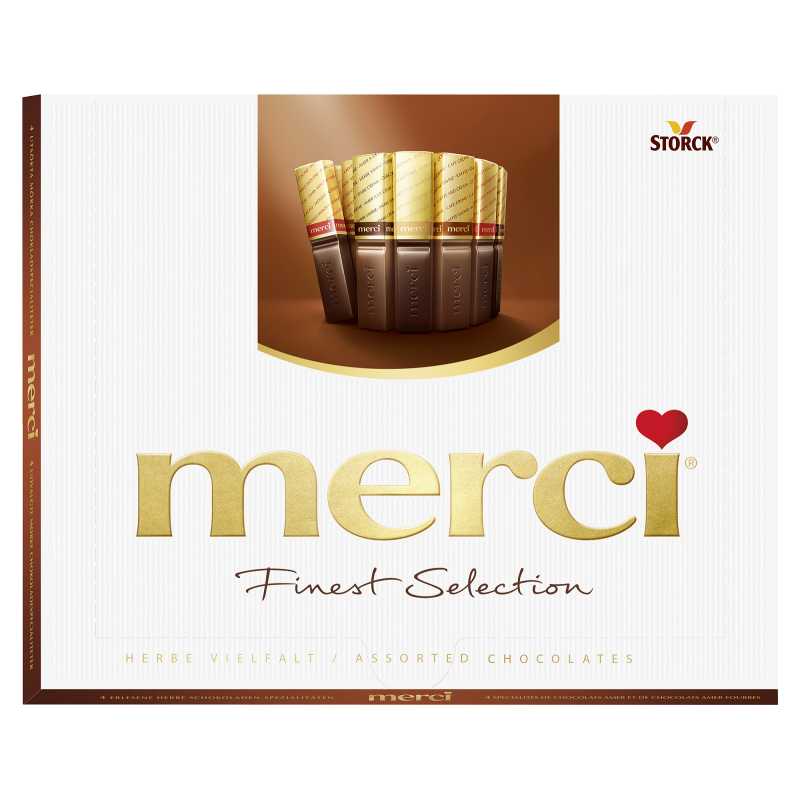 Šokoladinių saldainių rinkinys MERCI HERBE - keturių rūšių tamsaus šokolado saldainių rinkinys su tamsaus kremo, kavos su grietinėle, tamsaus šokolado ir švelnaus marcipano įdarais.