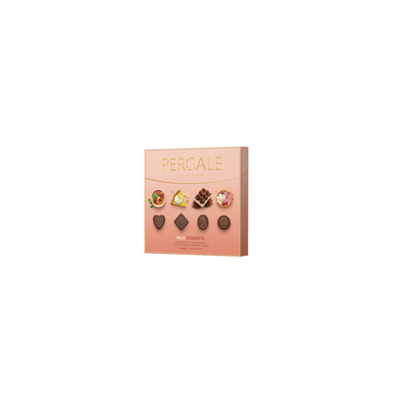 Saldainiai su įdarais: aviečių-sūrio pyrago skonio įdaro 11%; citrinų pyrago skonio įdaro 11%; krembliulė skonio įdaro 11%; tiramisų skonio įdaro 11%. Pieniškas šokoladas 56% (cukrus, nenugriebto PIENO milteliai, kakavos sviestas, trinta kakava, augaliniai riebalai (įvairiomis dalimis: alyvpalmių, sviestmedžių), nugriebto PIENO milteliai, emulsikliai: SOJŲ lecitinai, poliglicerolio poliricinoleatas; kvapioji medžiaga), cukraus sirupas (cukrus, vanduo), augaliniai riebalai (palmių branduolių, palmių), gliukozės sirupas, maskarponė SŪRIO pasta 1,8% (maskarponės SŪRIS 50% (pasterizuota GRIETINĖLĖ, pasterizuotas nenugriebtas PIENAS, rūgštingumą reguliuojanti medžiaga citrinų rūgštis), cukrus, pasterizuotas nenugriebtas PIENAS, pasterizuoti KIAUŠINIŲ tryniai, etilo alkoholis, kvapiosios medžiagos), saldintas sutirštintas PIENAS, drėgmę išlaikanti medžiaga glicerolis, maltodekstrinas, tiramisų pasta 0,5% (cukrus, KIAUŠINIŲ skonio vynas (vynas, cukrus, etilo alkoholis, „Marsala“ vynas, dažiklis sulfitinė amoniakinė karamelė, KIAUŠINIŲ trynių milteliai, kvapioji medžiaga) (sudėtyje yra SIEROS DIOKSIDAS), „Marsala“ vynas (sudėtyje yra SIEROS DIOKSIDAS), GLIUKOZĖS SIRUPAS, KIAUŠINIŲ trynių milteliai, vanduo, etilo alkoholis, kvapiosios medžiagos, dažiklis amoniakinė karamelė, modifikuotas krakmolas), emulsikliai: SOJŲ lecitinai, riebalų rūgščių mono- ir digliceridai; koncentruotos aviečių sultys 0,27%, kvapiosios medžiagos, valgomoji druska, karamelizuoto cukraus sirupas (gliukozės sirupas, cukrus, vanduo), konservantas kalio sorbatas, koncentruotos citrinų sultys 0,02%, dažiklis kurkuminas. Gali būti ŽEMĖS RIEŠUTŲ, LAZDYNŲ, MIGDOLŲ, GLITIMO (KVIEČIŲ) ir jų produktų. Pieniško šokolado masėje kakavos sausųjų medžiagų ne mažiau kaip 25%; pieno sausųjų medžiagų ne mažiau kaip 14%. Pieniško šokolado masė su kakavos sviestu ir kitais augaliniais riebalais. Ant pakuotės pavaizduoti produktai nebūtinai yra sudedamieji šios prekės komponentai.